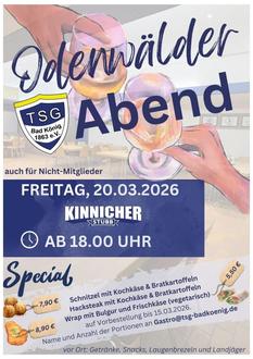 Am Freitag, 20.03.2026, lädt die TSG Bad König zum Odenwälder Abend in die Kinnicher Stubb ein.