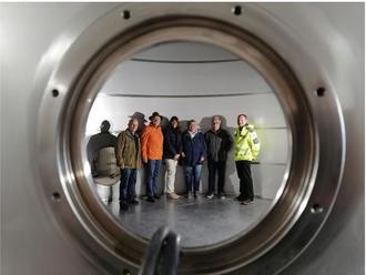 Ein Blick durch das Bullauge in einen der beiden Edelstahltanks zeigt von links Jürgen Weber(Bauunternehmer), Bernhard Geist (Erster Stadtrat), Melanie Weidtmann (Stadtbauamt), Andrea Eick (ARZ- Ingenieure), Otto Pollini (Hydro Elektrik), Thomas Boll (ISB).
