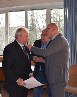 Günter Rummel aus Reichelsheim (l.) erhält die Nadel zum Ehrenbrief des Landes Hessen von Landrat Frank Matiaske (r.) im Beisein von Jürgen Göttmann, Vorsitzender der Gemeindevertretung Reichelsheim (Mitte).