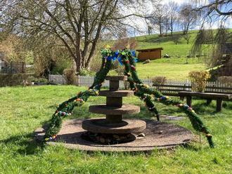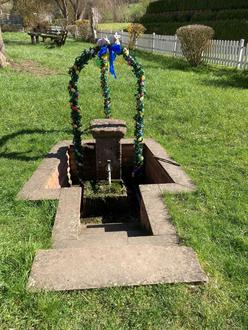 Neben dem „Großen Brunnen“ in Bad König sind auch viele Brunnen in den Stadtteilen - wie hier in Fürstengrund der alte Schulbrunnen und der neuere Brunnen auf der Brunnenanlage - wieder österlich geschmückt und verschönern das Stadt- bzw. Ortsbild.