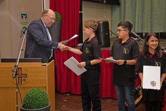 Bürgermeister Axel Muhn mit den Geschwistern Fabienne und Joana Alessia Schönfelder bei der Aushändigung der Belobigungen im Auftrag des Hessischen Ministerpräsidenten