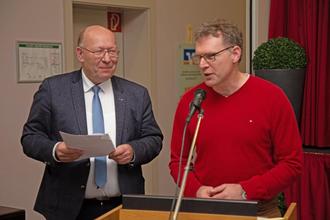 Bürgermeister Axel Muhn mit dem Trainer der Leichtathletikabteilung der TSG Bad König, Jochen Lorenz, der die Ehrungen dreier Leichtathleten entgegennahm