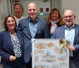 Landrat Frank Matiaske (rechts) dankt Martin Müller für seine langjährige, kompetente Mitarbeit und überreicht ihm ein Bild mit Odenwälder Sehenswürdigkeiten. An der Feierstunde nahm auch Müllers Ehefrau Doris Waldeck-Müller (links) teil. Ihren Dank sprachen auch die Gleichstellungsbeauftragte Petra Karg (zweite von links) und die Personalratsvorsitzende Britta Ziefle aus.