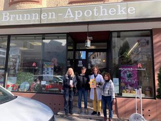 Übergabe des Leon Hilfe-Insel-Schilds an die Kurapotheke v. l.: Carina Oberle (Polizeidirektion Erbach); Christiane Kees (Ordnungsamt Bad König), Ursula Geiß-Hinz (Brunnenapotheke), Elke Seipp-Guthier (Ausschuss für Soziales, Kultur, Jugend und Sport)