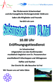 10.00 Uhr Gottesdienst zur Eröffnung der Badesaison (Pfr. Stracke) im Freibad Vielbrunn unter Beteiligung der Konfirmanden und des Posaunenchors