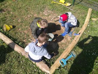 Irgendwann äußersten die Kindern den Wunsch, eine richtige „Archäologie-Ecke“ zu bekommen. Dieser Wunsch, konnte mit Hilfe des Bauhofs erfüllt werden. Die Vorarbeiten dazu wurden von den Kindern genaustens beobachtet und begleitet. Es wurde ein geeigneter Platz gesucht, abgemessen und Hölzer verlegt, damit die „Ausgrabungsarbeiten“ räumlich begrenzt bleiben.