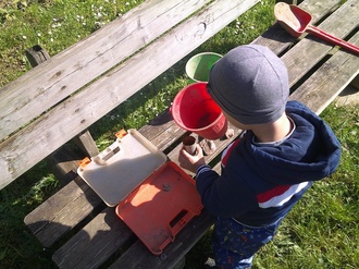 Die unterschiedlichen Bodenbeläge werden genau beobachtet und in unserem Sandkasten wurde bis auf dem Grund gegraben.