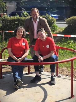 Das Bild zeigt Sandra Schäfer und Raffaela Boßler-Romano von der Spielplatzinitiative Bad König. Dahinter Dirk Daniel Zucht, Vorstandsvorsitzender der Odenwald-Stiftung.