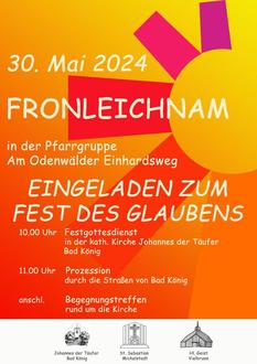 Am kommenden Fronleichnamsfest (Donnerstag, den 30. Mai) feiern die katholische Pfarreien der Pfarrgruppe „Am Odenwälder Einhardsweg“ zusammen das Fest in Bad König. Der gemeinsame Festgottesdienst beginnt um 10 Uhr in der katholischen Pfarrkirche St. Johannes der Täufer in Bad König. An den Gottesdienst schließt sich die Fronleichnamsprozession durch den Ort an. Ab 12 Uhr findet ein Begegnungstreffen mit Essen und Trinken rund um die Kirche statt.