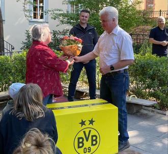 Bastian Ehrhardt, der Leiter der Kita, würdigte Frau Karl in einer anerkennenden Ansprache für ihr langjähriges Wirken und ihre Verdienste. Die Kinder der Kita sorgten mit dem Lied „Wir schenken dir einen Regenbogen“ für einen besonders rührenden Moment. Auch Geschenke durften natürlich nicht fehlen: Neben Pralinen, einem Blumenstrauß und zwei Mini-Fußballtoren in den Farben ihres Herzensvereins Borussia Dortmund – Gelb und Schwarz – überreichte das Team ihr als bleibendes Zeichen der Wertschätzung einen geschmückten Baum.