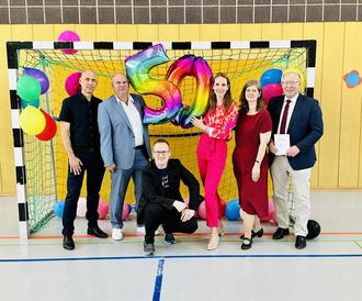 Die 50 im Handballtor der Grundschul-Sporthalle in der Martin-Luther-Straße ist umrahmt von links Schulleiter Karsten Schneider, Erster Kreisbeigeordneter Oliver Grobeis, Fördervereinsvorsitzender Reinhard Geist, Landtagsabgeordnete Sandra Funken, Abteilungsleiterin Sprachheilförderung Anke Wenzler und Bürgermeister Axel Muhn.