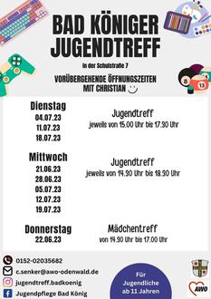 Bis die Stelle der Jugendpflege neu besetzt ist, wird mein Kollege Christian Senker (AWO Odenwaldkreis e.V.) vertretungsweise die Angebote übernehmen. Die vorübergehenden Öffnungszeiten sowie Kontaktdaten finden Sie auf dem Flyer.