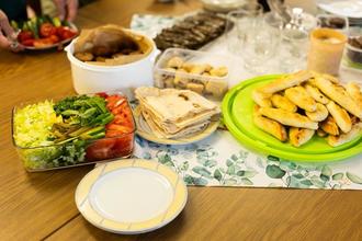 Kulinarisch wurden wir verköstigt mit leckerem Falafel, würziger Hummus-Joghurtsoße und Salat. Am besten isst man diese Zutaten eingerollt in dünnem Teig. All das haben Frauen, die regelmäßig am Frauencafé teilnehmen, zubereitet und mitgebracht. An dieser Stelle möchten wir uns herzlich für die Speisen bedanken!