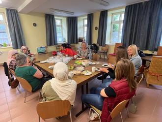 Am vergangenen Mittwoch, den 19. Juni 2024, fand das Frauencafé in der Alten Schule unter einem bestimmten Motto statt: Es sollte syrisches Essen geben und die Zubereitungsart der Speisen mitgeteilt werden. Da aber gerade auch die Fußball Europameisterschaft stattfindet, für die sich im Frauencafé auch alle Frauen interessieren, haben wir einen Laptop aufgestellt und das Spiel verfolgt.
