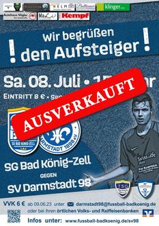 Wir sind sehr erfreut darüber, dass das Interesse an dem Testspiel SG Bad König/Zell gegen den SV Darmstadt 98 am kommenden Samstag sehr hoch ist. Das Spiel ist ausverkauft. Wir bitten um Verständnis, dass wir keine Tageskasse mehr anbieten können.