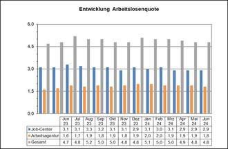 Zieht man den Vergleichszeitraum von vor einem Jahr heran, waren hier im Juni rund 130 Personen weniger arbeitslos. Der Bedarf nach Personal, vor allem nach Fachkräften, bewegt sich weiterhin auf einem hohen Niveau, allerdings geht die Nachfrage nach Arbeitskräften seit geraumer Zeit zurück, was sich letztendlich auch in den letzten Monaten zeigt. Der Bestand an Arbeitslosen verweilt auf fast gleichem Niveau.