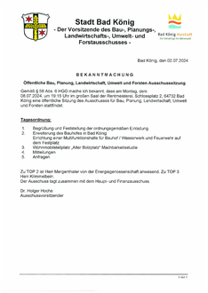 Gemäß § 58 Abs. 6 HGO mache ich bekannt, dass am Montag, dem 08.07.2024, um 19:15 Uhr im großen Saal der Rentmeisterei, Schlossplatz 2, 64732 Bad König eine öffentliche Sitzung des Ausschusses für Bau, Planung, Landwirtschaft, Umwelt und Forsten stattfindet.