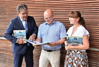 Kreistagsvorsitzender Rüdiger Holschuh, Landrat Frank Matiaske und Konstantina Koch aus der Abteilung Öffentlichkeitsarbeit der Kreisverwaltung präsentieren die frisch gedruckte Publikation zum 50. Kreisjubiläum (v. l. n. r.)