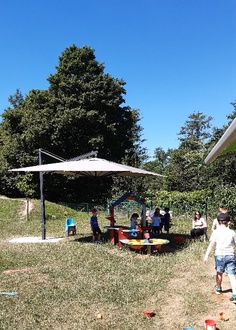Gerade an sehr warmen Tagen wird schon früh am Morgen im Freigelände gespielt und alle freuen sich über den neuen „Schattenspender“!