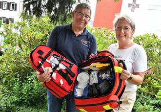 „Jetzt können wir die Beschaffung unserer Einsatzmittel etwas entspannter angehen und die Notfallrucksäcke mit den ausgewählten Materialien ausstatten“, freute sich Oskar Marx, Projektleiter der 17 Helfer vor Ort Gruppen (HvO) kürzlich, als ihm Wiola Weyrauch, Mitarbeiterin der DRK-Modetruhe in Erbach, eine Spende in Höhe von 2000 Euro übergeben hat. Das Geld stammt aus den Erlösen der Secondhandgeschäfte `Modetruhe´ in der Kreisstadt und der `Lieblingsstücke´ in Reichelsheim. Regelmäßig kommen erwirtschaftete Überschüsse sozialen Projekten dem Kreisverband des Roten Kreuzes zu und stärken somit dessen Leistungsfähigkeit für die Bürgerinnen und Bürger Im Odenwaldkreis. Fast 100 Voraushelfer sind in den Ortschaften aktiv dabei, um mit ihren Kenntnissen in Erster Hilfe das Zeitintervall zu überbrücken, bis bei einem Notfall der Rettungsdienst eintrifft. Jede Gruppe verfügt über eine Leitung, die Fachaufsicht hat der Ärztliche Leiter Rettungsdienst (ÄLRD) des Odenwaldkreises. Die Einsatzbereitschaft des ehrenamtlichen Personals wird durch regelmäßige Fortbildungen gestützt. Die Summe wird anteilig gesplittet und für notwendige Ersatzbeschaffungen verwendet.