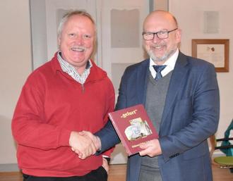 Einer von 24 Autorinnen und Autoren des neuen „gelurt“: Landrat Frank Matiaske (rechts) bedankt sich bei Thomas Maul aus Lautertal. Sein Beitrag mit dem Titel „Miameide – Anmerkungen zu einem Tanzvers“ befasst sich mit der Eibe und deren mythologischer Bedeutung.