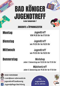Zudem möchte ich Sie daran erinnern, dass der Jugendtreff nun auch montags von 14.30 Uhr bis 17.00 Uhr den Jugendlichen zur Verfügung steht (siehe Flyer).