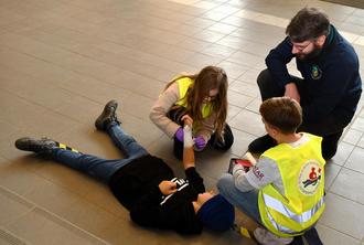 „Diesen haben sie aber nur in den Pausen, um die Mädchen und Jungen nicht zu überfordern. Zuvor holen sie sich ihre DRK-Warnwesten mit Reflexstreifen ab, damit man sie auf dem Hof auch als Helferinnen und Helfer erkennen kann und wappnen sich mit ihrem Einsatztäschchen. Im Bedarfsfall wird dann ein Pflaster geklebt oder es werden einfache Verbände angelegt. Für größere Verletzungen ist die Aufsicht führende Lehrkraft zuständig. Bewusst geht es uns nur um einfache Maßnahmen der Ersten Hilfe“, erläutert Knecht und unterstreicht: „Zum Helfen ist keiner zu klein!“