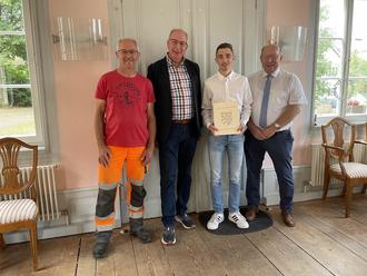 Mit Patrick Wamßer freuten sich über das tolle Prüfungsergebnis (von links) Personalratsmitglied und Bauhofmitarbeiter Alexander Körner, Hauptamts- und Ausbildungsleiter Markus Best und Bürgermeister Axel Muhn
