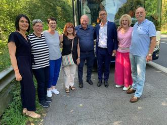 Unser Foto zeigt kurz vor der Ankunft in der Partnerstadt von links: Sophie Chambon, Isolde Muhn, Ellen Nisch, Nicole Farges, Bürgermeister Axel Muhn, Bürgermeister Sébstien Duchamp, Hannelore und Bernhard Geist