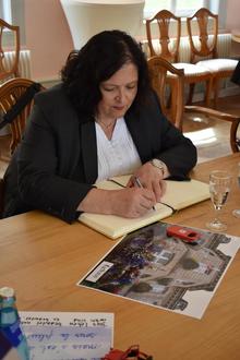 Nach weiteren Berichten aus der Arbeit des Bad Königer Komitees, für die Staatssekretärin Müller ersichtlich ein offenes Ohr hatte, bedankte sich der Komiteevorstand bei der Wiesbadener Politikerin und überreichte ihr ein Exemplar der aus Anlass des 40jährigen Bestehens der Partnerschaft herausgegebenen Festschrift. Nachdem sich die Staatssekretärin ins Gästebuch der Stadt Bad König eingetragen hatte, übergab ihr auch Bürgermeister Hofferbert als Gastgeschenk eine Abbildung der Bad Königer Schlösser auf Schiefer.