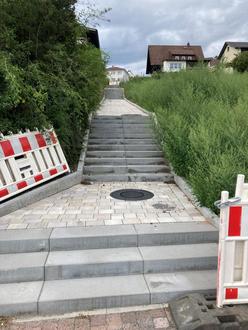 Der Treppenweg zwischen der Mainstraße und der Kimbacher Straße wurde aufgrund der Verlegung eines neuen Regenwasserkanals ebenfalls neu hergestellt und ist weitgehend fertiggestellt. Es fehlen noch die Handläufe an den Treppenstufen und kleinere Pflasterarbeiten im oberen Bereich der beliebten Abkürzung, die nun schon bald wieder uneingeschränkt genutzt werden kann.
