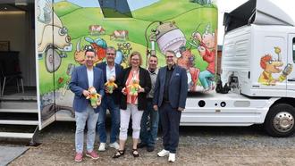 Eindrucksvoll: der umgestaltete LKW, den das Kommunale Job-Center und die InA gGmbH als rollendes Beratungszentrum nutzen werden. Davor und mit InA-Maskottchen GINO in der Hand stehen (von links) Kreisbeigeordneter Michael Vetter, Kreistagsvorsitzender Rüdiger Holschuh, Staatssekretärin Katrin Hechler, Torsten Beilstein, Abteilungsleiter im KJC, und InA-Geschäftsführer Siegfried Eberle