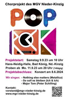 Das Projekt starte am Samstag den 9.9.2023 um 10 Uhr mit einem Probentag. Die weiteren Proben finden 14tägig montags um 20:00 Uhr statt. Wir treffen uns in Nieder-Kinzig in der Hans-Neidig-Halle am Sportplatz. Mit einem Konzert am 8.6.2024 wird das Projekt abgeschlossen.