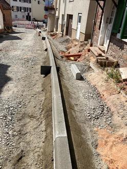 Die Bordsteine wurden jetzt gesetzt nachdem die Wasserleitungs- und Kanalarbeiten im unteren Bereich fertiggestellt sind und der Bereich auf der Kimbacher Straße soll in den nächsten 14 Tagen asphaltiert werden, um die Behelfsampel und die einseitige Sperrung entbehrlich zu machen.