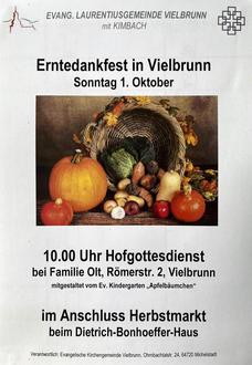 10.00 Uhr Erntedank-Hofgottesdienst (Pfr. M.-S. Stracke) bei Familie Olt, Römerstr. 2, Vielbrunn im Anschluss Herbstmarkt am Dietrich-Bonhoeffer-Haus