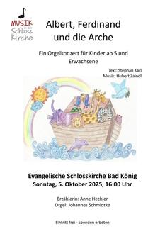 Herzliche Einladung zu einem unterhaltsamen Orgelkonzert für Familien am Sonntag, dem 05.10.2025, um 16:00 Uhr, in der Evang. Schlosskirche Bad König. Um welche biblische Geschichte es bei "Albert, Ferdinand und die Arche" wohl geht, ist unschwer zu erraten!