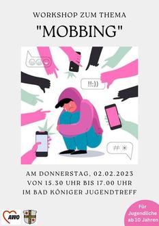 Am Donnerstag, den 02.02.2023 wird den Jugendlichen ein Workshop zum Thema „Mobbing“ angeboten. Die Jugendlichen werden die verschiedenen Formen, Ursachen und Folgen von Mobbing kennenlernen. Außerdem werden ihnen Möglichkeiten aufgezeigt, um dagegen zu handeln.