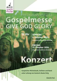 „Give God Glory“ – „Gib Gott die Ehre“ oder auch „Lobe den Herrn“ – so ist der Titel der Gospelmesse und des gesamten Konzertes. Ausführende sind der Gospelchor, Solisten und Band unter der Leitung von Kantorin Beate Ihrig, Michelstadt. Der Eintritt ist frei.