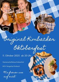 Der Countdown läuft, unser „Original Kimbacher Oktoberfest“ steht wieder an, Stimmung und Gaudi bei freiem Eintritt mit der Blaskapelle Watterbach-Breitenbuch auf der Kimbacher Wies`n im Gemeinschaftshaus erleben. Wir freuen uns auf viele Besucher und garantieren eine tolle Party. Lederhose und Dirndl erwünscht, sei dabei und genieße den bayerischen Flair im Kimbachtal!