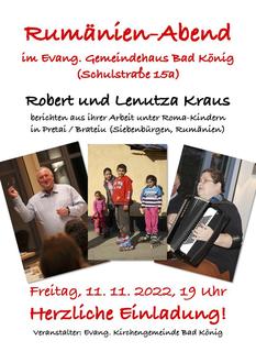 Nun kommen Robert und Lenutza Kraus wieder einmal nach Bad König, um von ihrer Arbeit zu berichten. Sie werden das tun in einem Gemeindeabend am Freitag, 11. November, um 19 Uhr im Evang. Gemeindehaus. Neben Bildern bzw. Videos wird Robert Kraus in seiner mitreißenden Art über die aktuelle Situation berichten, die zur Zeit auch durch die Betreuung von Ukraine-Flüchtlingen geprägt ist. Seine Ehefrau Lenutza wird den Abend durch den Vortrag einiger rumänischer Lieder bereichern.
