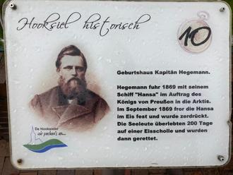 Bad König/Odenwald-Hooksiel/Wangerland. Im Jahre 1869- etwa drei Jahre früher als Weyprecht und Payer (Entdeckung des Kaiser-Franz-Joseph-Landes)- bricht Kapitän Paul Hegemann (* 26.8.1836 in Hooksiel, + 14. Juni 1913 in Goslar) mit seiner Mannschaft und dem Schiff „Hansa“ im Auftrag des Königs von Preußen in die Arktis (Ostgrönland-Expedition) auf. Im Spätsommer des Jahres 1869 fror die „Hansa“ fest, wurde zerdrückt. Die Seeleute überlebten 200 Tage (!) auf einer Eisscholle, wurden dann gerettet. Es wird in dieser dramatischen Hinsicht Ähnlichkeiten zu der unter der (österreichischen) Habsburger Flagge im Juni 1872 starteten „Tegethoff“ von Carl Weyprecht geben. (Foto-rn: Plakette Hooksiel/Wangerland). Literatur: Reinhard Krause: Zweihundert Tage im Packeis, Hamburg 1997. Ihr Heimat- und Geschichtsverein Bad König e.V.