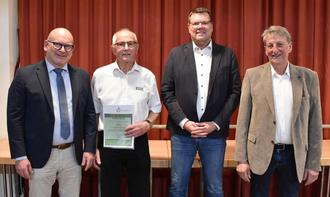 Leidenschaftlicher Sänger: Peter Arras vom MGV Eintracht 1854 Beerfurth ist für 70 Jahre Chorgesang geehrt worden. Mit ihm freuen sich (von links) Landrat Frank Matiaske, der Höchster Bürgermeister Jens Fröhlich und der Erste Stadtrat von Michelstadt, Roger Tietz.