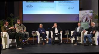 Miteinander im Gespräch: (von links) Moritz Krellmann, Carl Anton Prinz zu Waldeck und Pyrmont, Andrea Pfäfflin, Moderator Prof. Dr. Jan Wörner, Dr. Johannes Weidig und Dr. Lutz Fähser beim Odenwald-Dialog im Volksbank Atrium in Erbach.