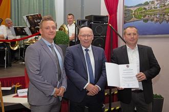 Stadtverordnetenvorsteher Dennis Weyrich, Bürgermeister Axel Muhn und Frank Hofferbert nach der Überreichung der Ernennungsurkunde.