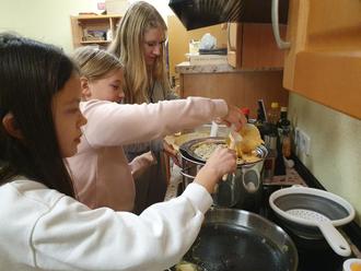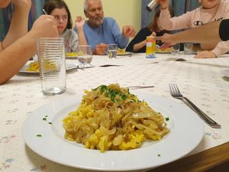 Zur Vorspeise bereiteten die Teilnehmenden eine cremige Kürbissuppe zu, bevor es mit leckeren Käsespätzle als Hauptgericht weiterging. Abgerundet wurde das Menü durch ein frisches Frischkäse-Orangen-Dessert, das die Gruppe gemeinsam anrichtete und anschließend in gemütlicher Runde genoss.