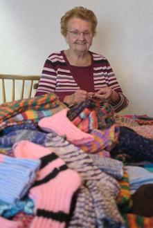In diesem Jahr hat die rüstige Rentnerin 120 Paar Socken gestrickt. Dabei geht ihr das Stricken so flott von der Hand, dass sie „multitaskingfähig“ die Socken beim Fernsehschauen „blind“ im Dunkeln stricken kann. Wichtig sei nur, dass sie im Gedanken immer die Maschen mitzählt. Nur, wenn eine Masche fällt, erzählt sie, muss sie das Licht anmachen, um die verlorene Masche wieder zu finden.