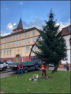 Der Baum ist eine Spende von Helmut Schneider aus Kimbach und konnte dank der tatkräftigen Unterstützung durch Jan Wassum (Foto) auf dem Schlossplatz aufgestellt werden.