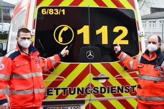 Notruftag 2023: Auf die wichtige Bedeutung der Notrufnummer 112 weisen hier Rettungssanitäter Marc Dammrau (links) und Notfallsanitäter Frederic Neff hin.