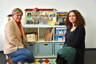 Ein offenes Ohr für Kinder: Sandra Veigl (links), die Leiterin der Beratungsstelle für Kinder, Jugendliche und Eltern, mit ihrer Kollegin Gesa Heimann. In einem eigenen Zimmer finden Kinder viele Möglichkeiten, um mitzuteilen, was sie bewegt. Zum Beispiel können sie das, was sie in der Schule erleben, in einem Haus nachstellen. Auch Spiele, Bücher und Bildkarten können helfen, miteinander ins Gespräch zu kommen.
