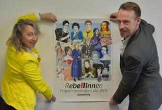 Gleichstellungsbeauftrage Petra Karg und der Mitarbeiter der Volkshochschule, Markus Dörr, machen Werbung für die gemeinsam mit den Jugendwerkstätten Odenwald, dem DGB Kreisverband Odenwaldkreis und dem Gewerbeverein sowie der Stadt Bad König organisierten Ausstellung „Rebellinnen“, die anlässlich des Internationalen Frauentags in Bad König gezeigt wird.